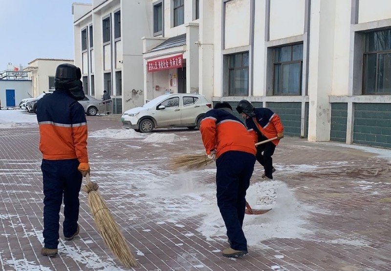 一早,大家分工有序,配合默契,干勁十足,揮舞著掃帚、鐵鍬等除雪工具,你鏟我掃,一派熱火朝天,將雪先掃到一處處集中堆放,再齊心協(xié)力搬運至墻角,不給“安全隱患”留機會。盡管戴著棉帽子,臉卻凍得通紅,但手中的工具卻也絲毫沒有松懈,除雪的身影依舊堅定穩(wěn)健。天氣雖冷,勞動的熱情卻溫暖了整個冬日,整潔的工服亦構(gòu)成一道道亮麗的風(fēng)景線。