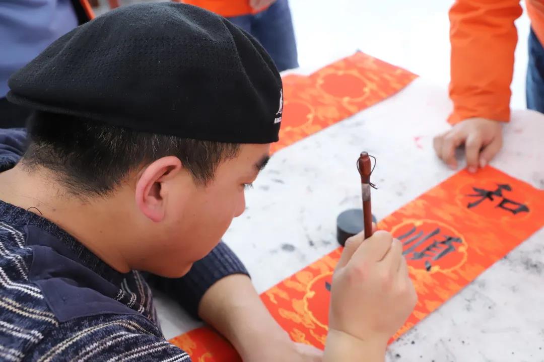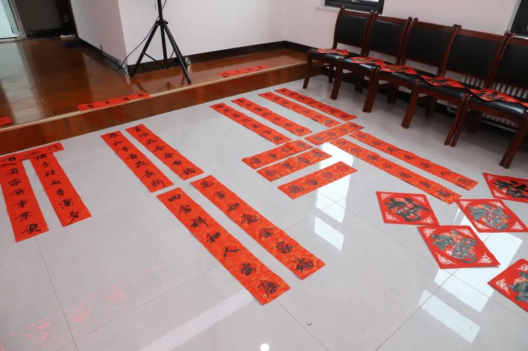 筆走龍蛇間,一張張筆酣墨飽、寓意吉祥的“?!弊?、春聯(lián)躍然紙上。集團(tuán)各單位書(shū)法愛(ài)好者和員工們?cè)缭鐏?lái)到書(shū)寫(xiě)現(xiàn)場(chǎng),一邊幫著鋪紙調(diào)墨,一邊井然有序地向書(shū)法家們“求”取自己中意的春聯(lián)和美好祝福。兩個(gè)多小時(shí),書(shū)法家們共寫(xiě)出了200余幅作品,并現(xiàn)場(chǎng)講解釋義、互動(dòng)交流,活動(dòng)現(xiàn)場(chǎng)鋪滿(mǎn)了春聯(lián)和福字,形成了一片熱鬧非凡的紅色海洋。
