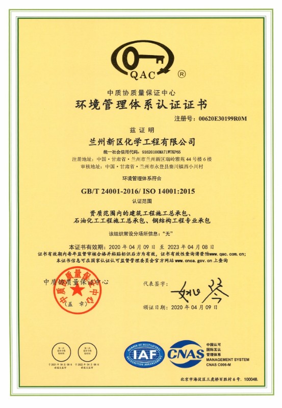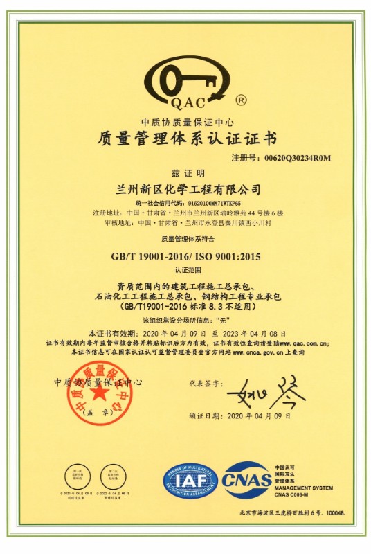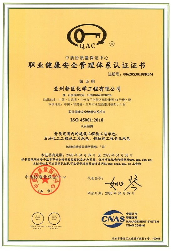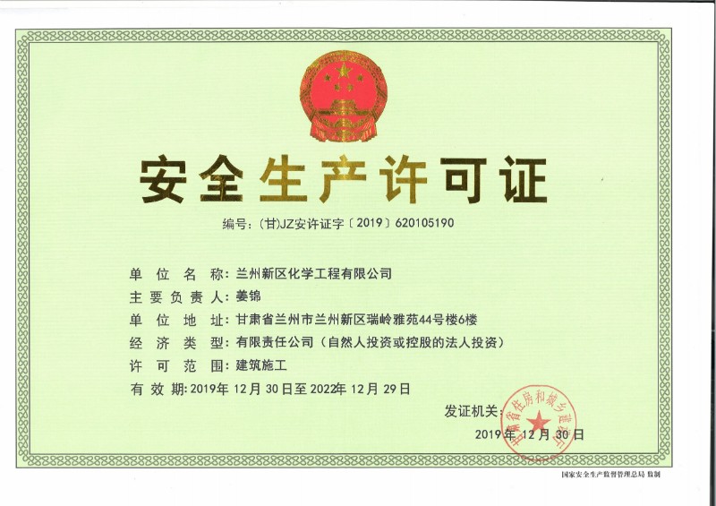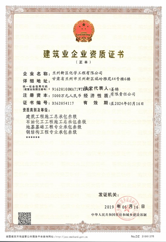 蘭州新區(qū)化學工程有限公司目前已取得了石油化工總承包三級、建筑工程總承包三級、鋼結(jié)構(gòu)專業(yè)承包三級、地基處理專項承包三級資質(zhì)。
