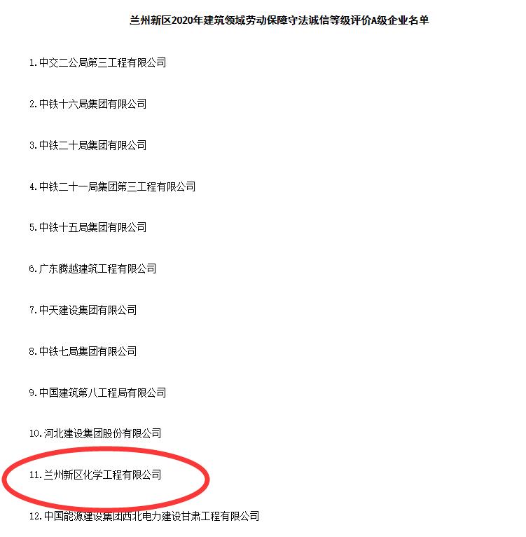 近日,從蘭州新區(qū)民政司法和社會保障局獲悉,蘭州新區(qū)化學(xué)工程有限公司被認定為蘭州新區(qū)2020年建筑領(lǐng)域勞動保障守法誠信等級評價A級企業(yè),成為蘭州新區(qū)唯一一家獲得此榮譽的新區(qū)國有企業(yè)。