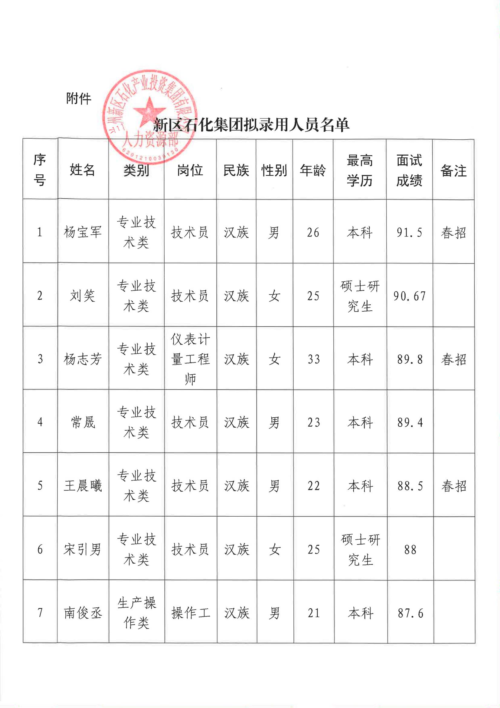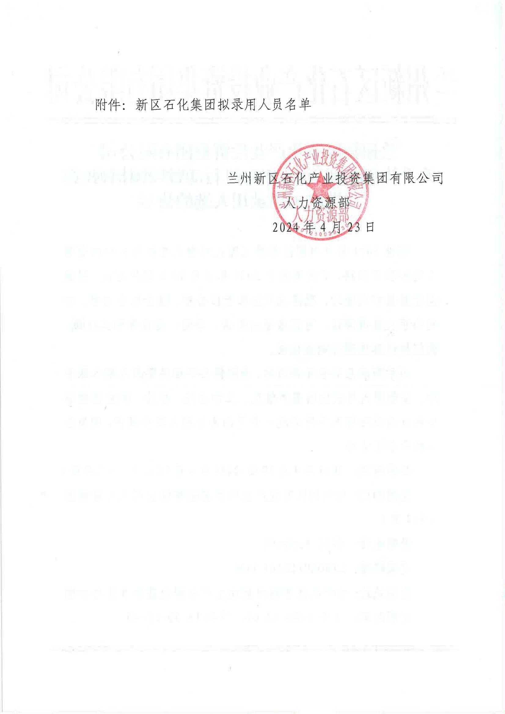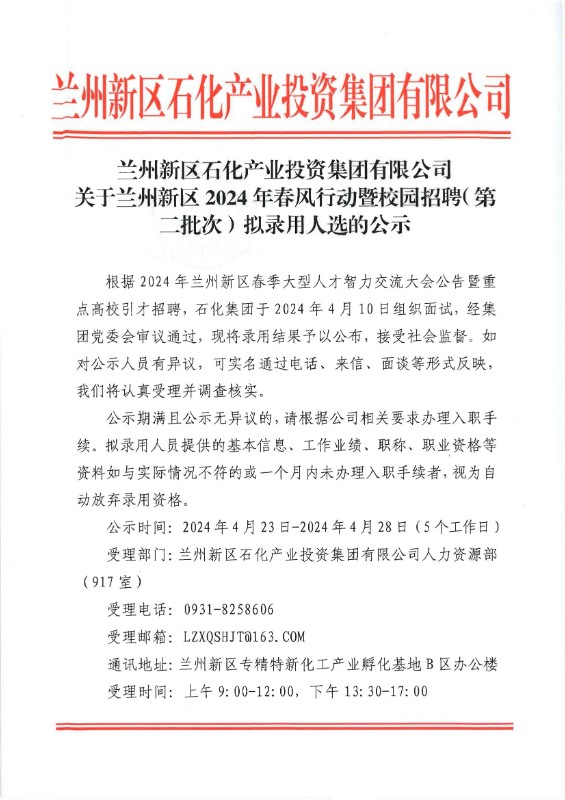 蘭州新區(qū)石化產(chǎn)業(yè)投資集團(tuán)有限公司 關(guān)于蘭州新區(qū)2024年春風(fēng)行動暨校園招聘(第二批次)擬錄用人選的公示