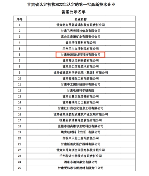 10月18日,科技部火炬中心發(fā)布了“關(guān)于對(duì)甘肅省認(rèn)定機(jī)構(gòu)2022年認(rèn)定的第一批、第二批高新技術(shù)企業(yè)進(jìn)行備案公示的通知”,其中專精特新化工產(chǎn)業(yè)孵化器內(nèi)的甘肅峻茂新材料科技有限公司和甘肅瀚聚藥業(yè)有限公司2家入駐企業(yè)被成功認(rèn)定為2022年高新技術(shù)企業(yè)。