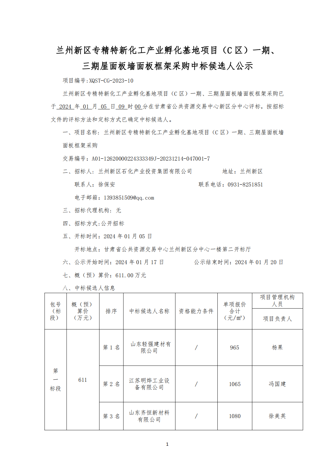 蘭州新區(qū)專精特新化工產(chǎn)業(yè)孵化基地項目(C 區(qū))一期、 三期屋面板墻面板框架采購中標(biāo)候選人公示